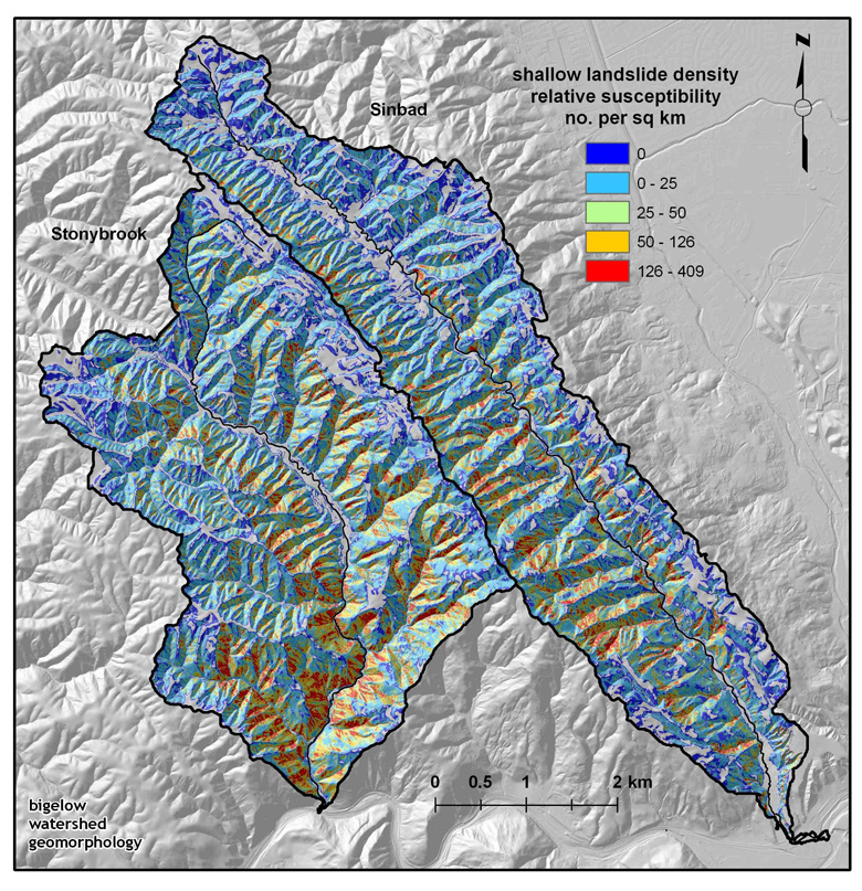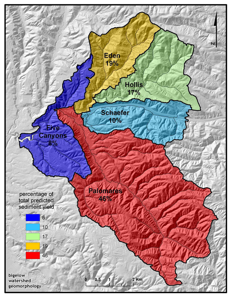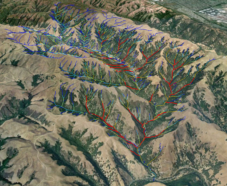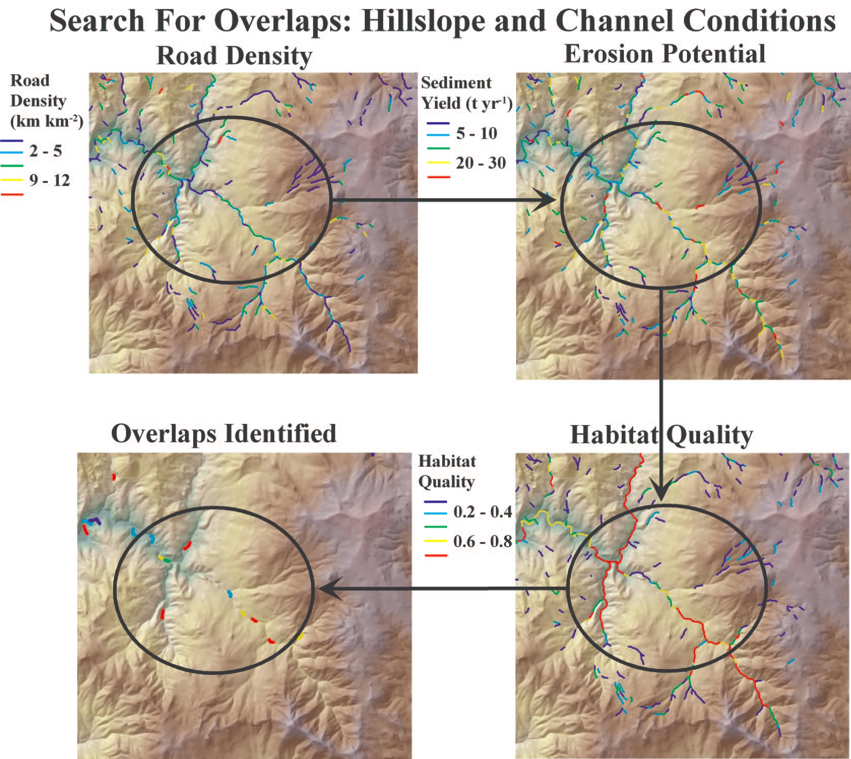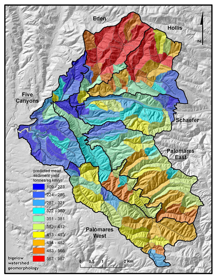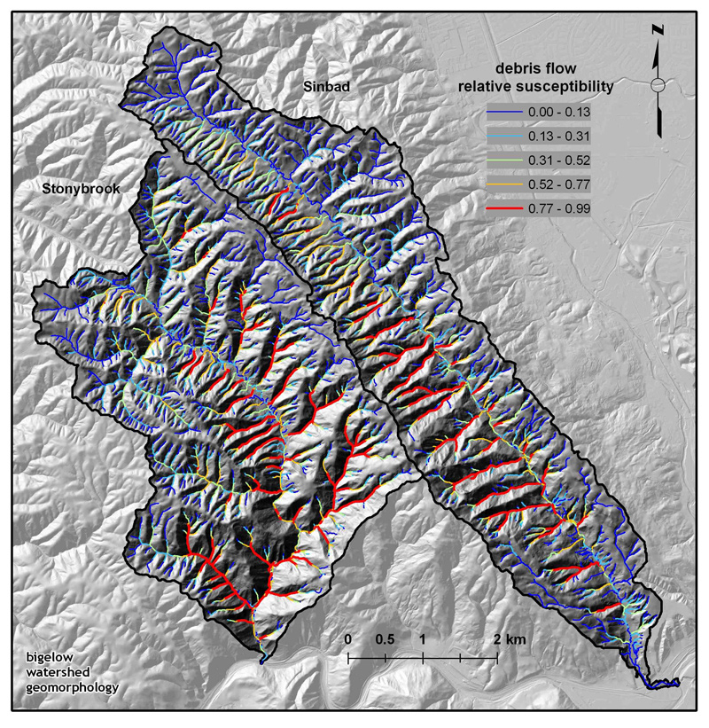 Geospatial terrain analysis provides spatially registered and largely automated mapping of watershed attributes that govern erosion, network, valley and channel morphologic types, and sources of riverine habitat heterogeneity over a range of spatial scales. Hillslope attributes, such as erosion potential (sediment supply), road density and stream crossings, etc. can be aggregated down to the reach scale and accumulated downstream to reveal patterns across multiple scales. Watershed attributes are aggregated up to subbasin scales, allowing comparative analyses across large watersheds and landscapes. We use a desktop watershed analysis system that contains approximately 100 parameters and 70 analysis tools (NetMap, Benda et al. 2007). Our recent terrain analyses have delineated sediment sources driven by steep and convergent terrain and estimated the relative contribution of tributary basins to the overall basin sediment yield. These projects identify and quantify which portions of a watershed are more erodible, incised, and prone to landslides and debris flows.